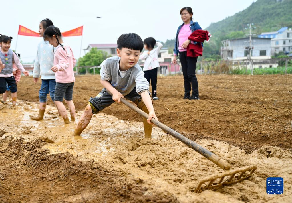 4月1日,在柳江區進(jìn)德鎮龍新村龍朝屯,小朋友在家長(cháng)陪同下體驗平整土地。