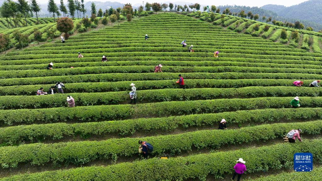 4月1日,村民在岑鞏縣天馬鎮一茶葉種植基地采摘明前茶(無(wú)人機照片)。