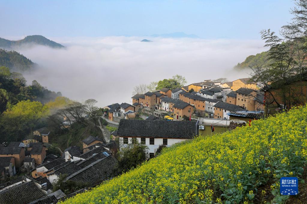 云霧繚繞的山村春景(4月1日攝)。