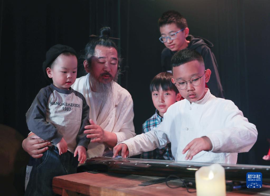 4月1日,小朋友在演出結束后體驗古琴演奏。