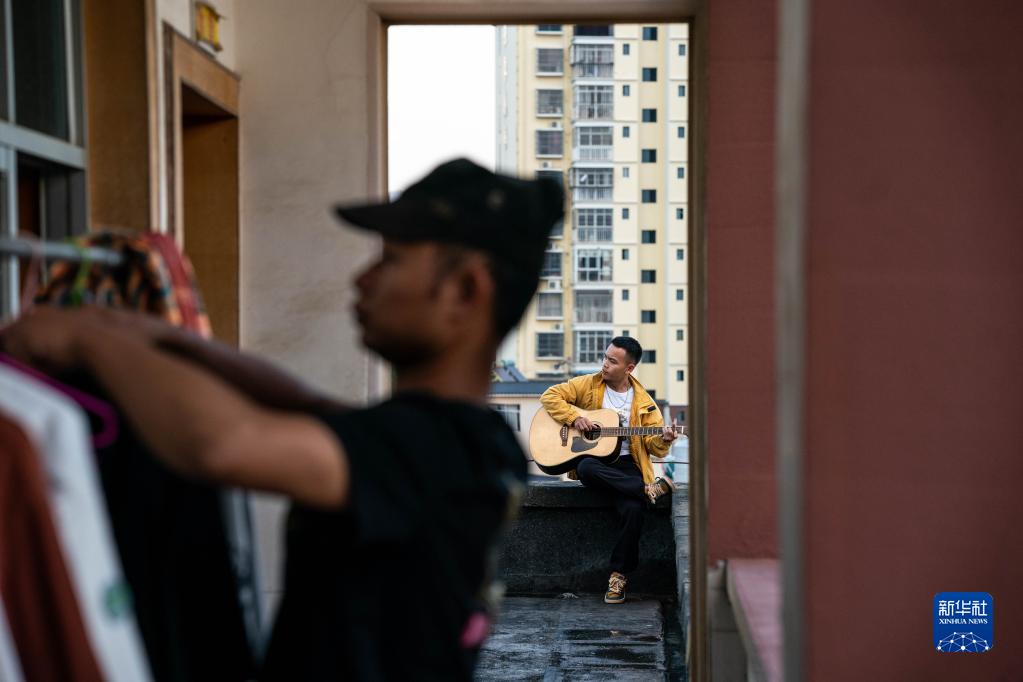 耿馬縣民族歌舞團演員能底(右)在宿舍樓露臺彈吉他(3月23日攝)。