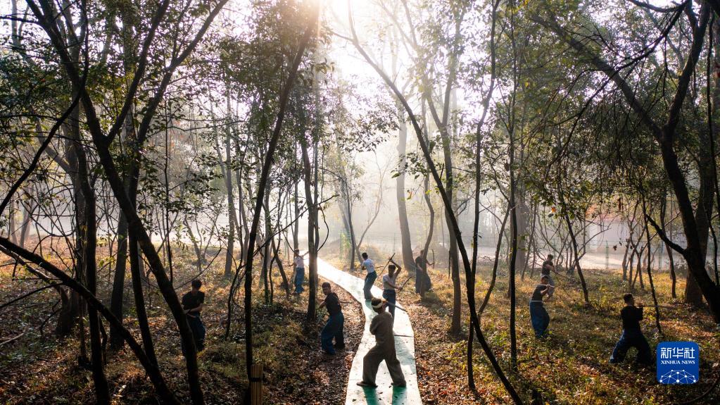耿馬縣民族歌舞團的演員們在練習刀舞(無(wú)人機照片,3月23日攝)。