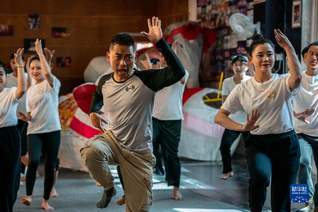 耿馬縣民族歌舞團團長(cháng)王峰(前左)在練功房和演員們一起練習耿馬傣族古樂(lè )舞(3月23日攝)。