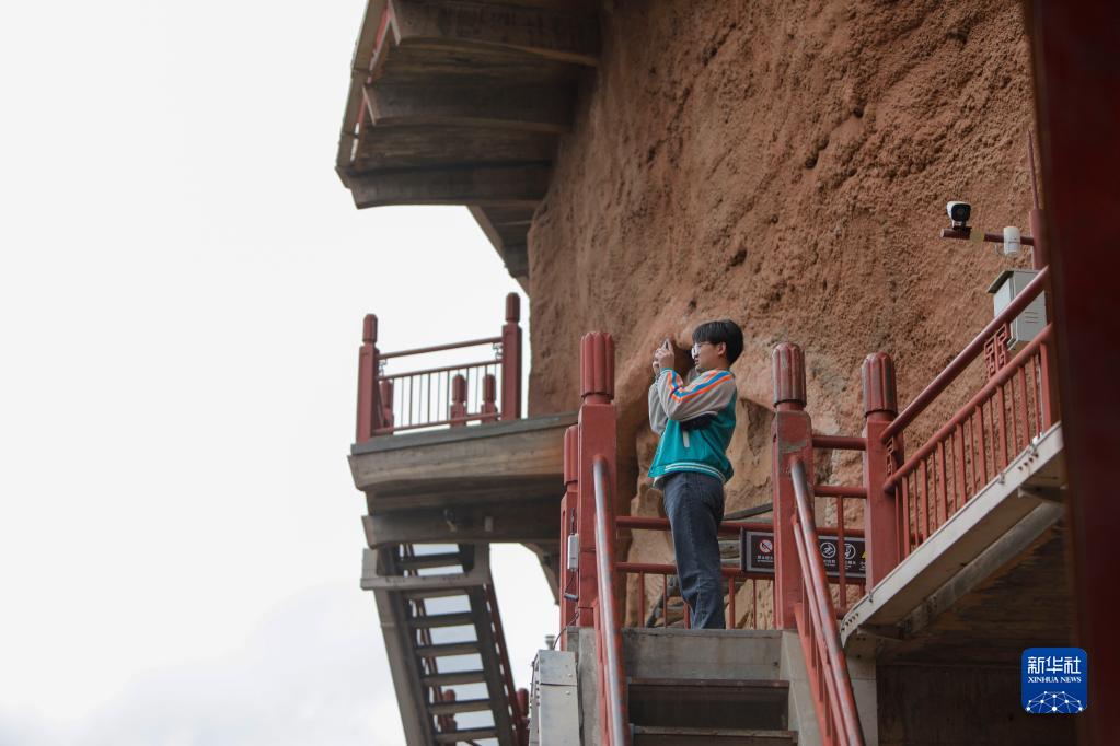4月1日,游客在麥積山石窟游玩。