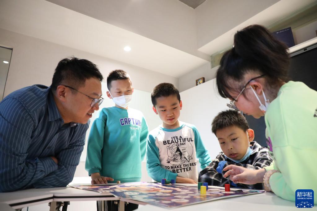 4月1日,在甘肅省蘭州市的讀者出版集團數字閱讀中心讀者小站,工作人員與小朋友一起玩“講述中國神話(huà)故事”的飛行棋游戲。