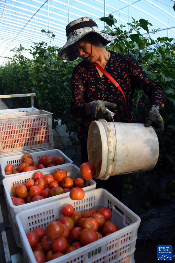 4月1日,在山東省棗莊市臺兒莊區馬蘭屯鎮按揭農業(yè)基地,菜農在采摘西紅柿。
