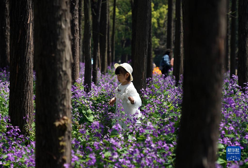 4月2日,在上海共青森林公園,小朋友行走在森林花海中。