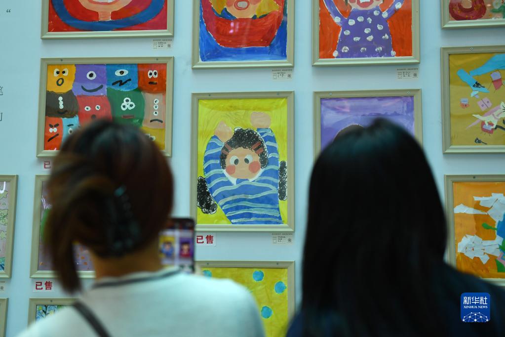 4月2日,市民在世界孤獨癥日主題慈善活動(dòng)現場(chǎng)觀(guān)看藝術(shù)畫(huà)作。