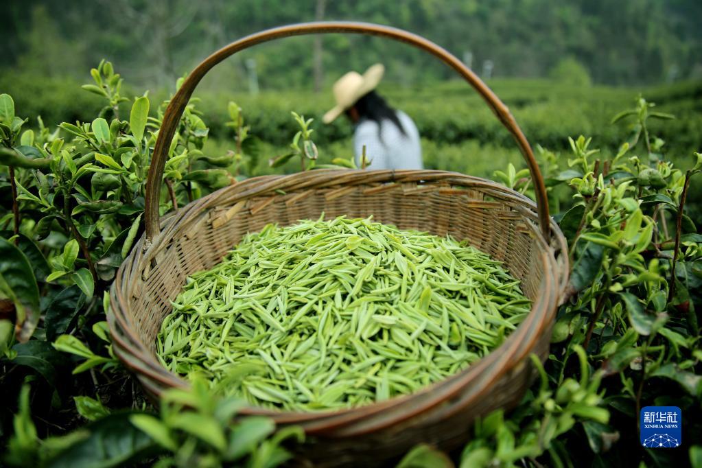 4月2日,茶農在湖北省十堰市鄖陽(yáng)區譚家灣鎮圩坪寺村茶葉基地采摘茶葉。