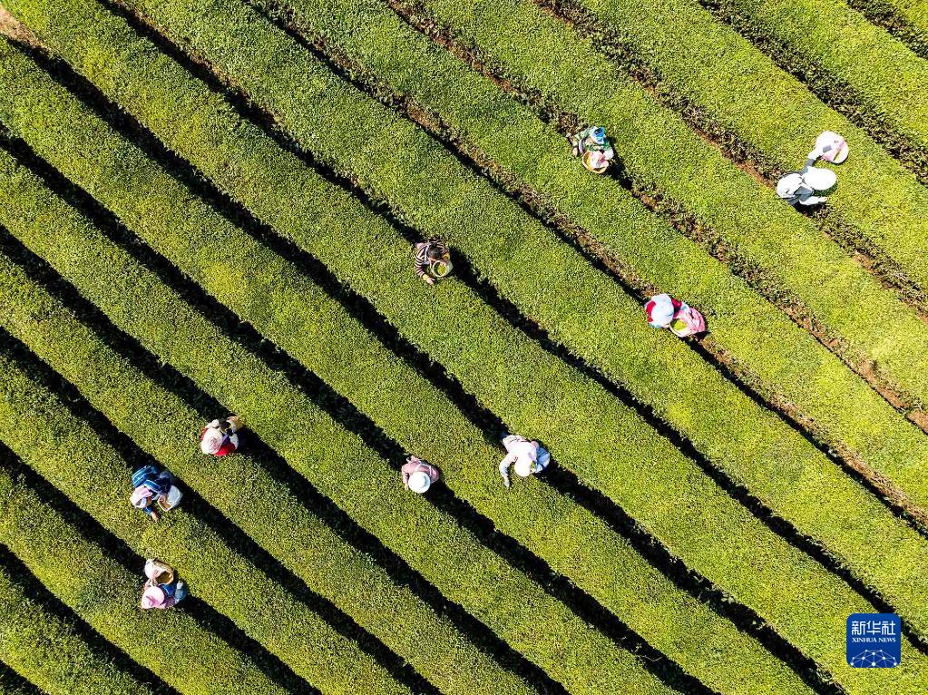 4月2日,茶農在貴州省安順市西秀區雙堡鎮一茶園采摘明前茶(無(wú)人機照片)。