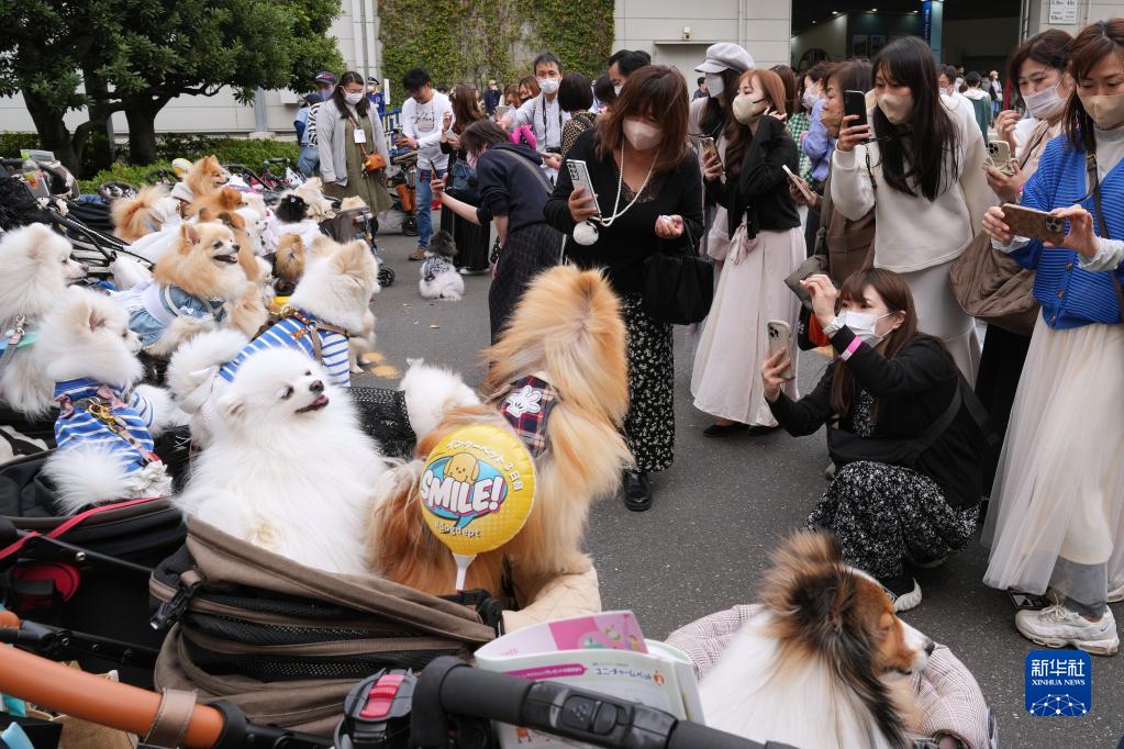 4月2日,人們在日本東京國際寵物用品博覽會(huì )上為寵物拍照。