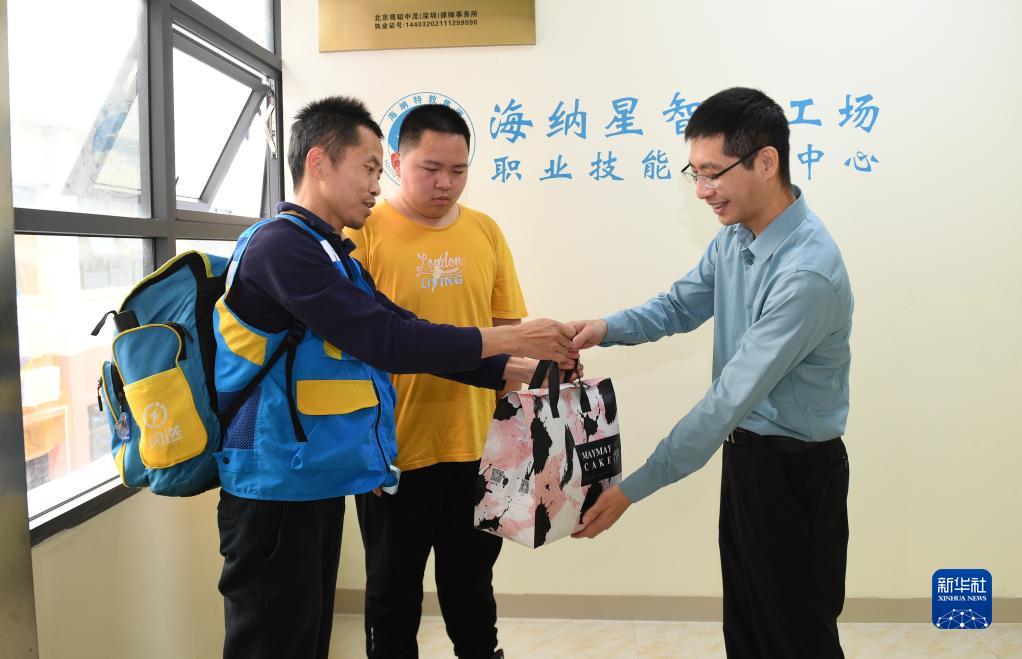 4月2日,黃志能(中)陪著(zhù)爸爸黃少禮去送單。訂單的訂貨人是黃志能所在康復機構的老師,到達目的地以后,黃少禮將蛋糕交給老師。