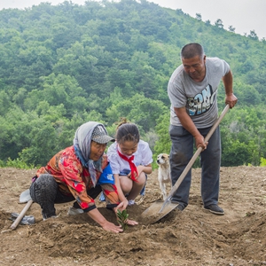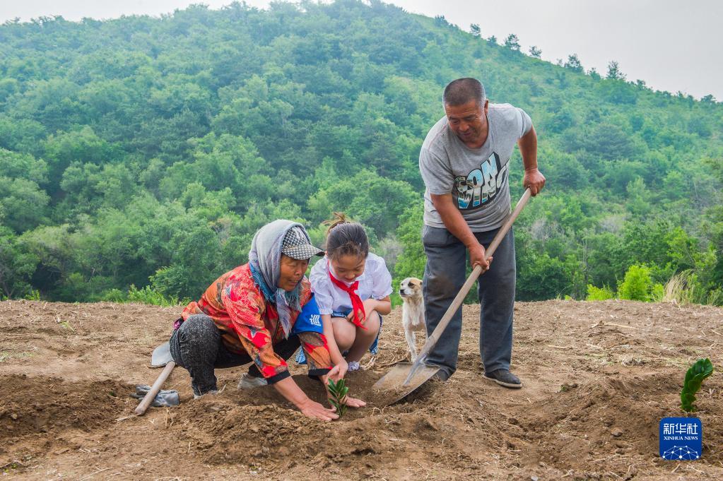 田萬(wàn)貴、陸敏夫婦和小朋友在遼寧省凌海市翠巖鎮前田屯村“鷺嶺”植樹(shù)(2022年6月3日攝)。