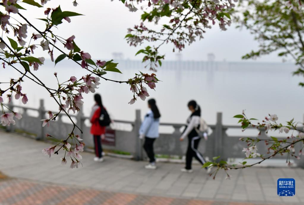 4月2日,游客在湖北省宜昌市秭歸縣屈原故里文化旅游區賞櫻游玩(無(wú)人機照片)。