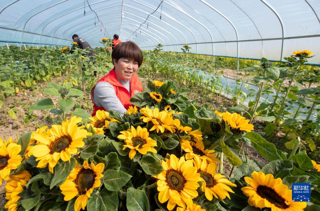 4月2日,在江蘇省海安市大公鎮仲洋村向日葵種植基地,農民整理待售的向日葵花。
