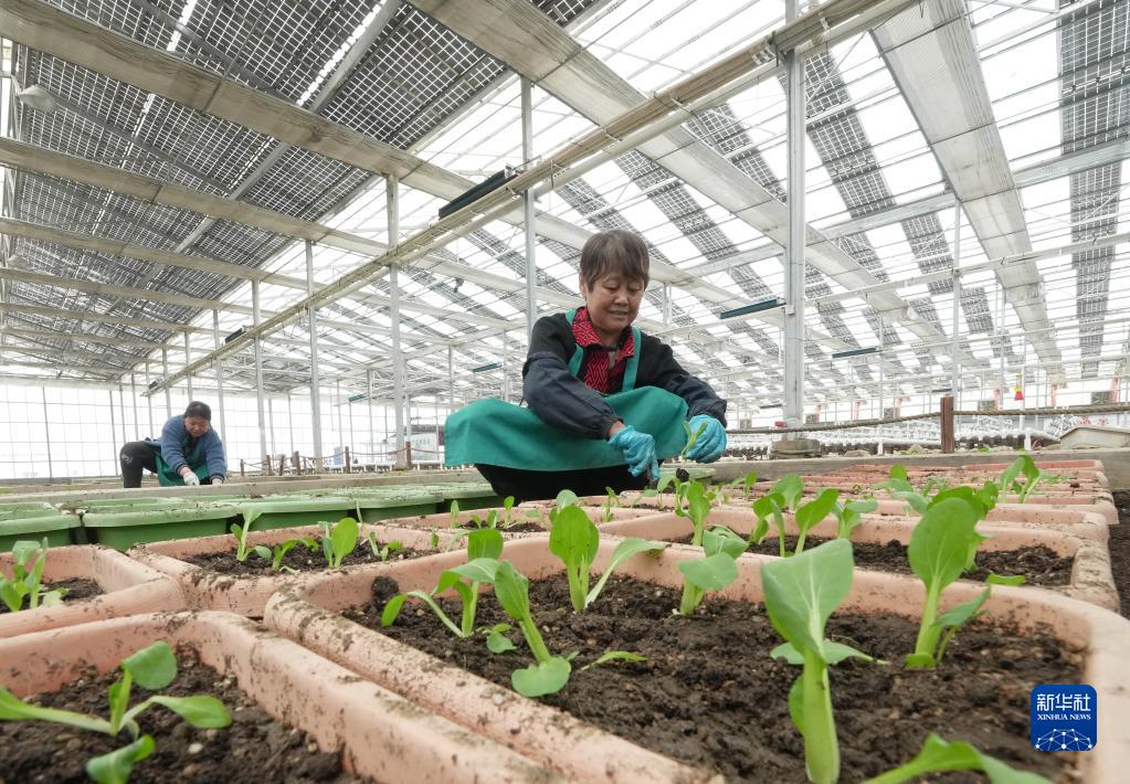 4月3日,工人在秦皇島市撫寧區墳坨鎮一處“農光互補”項目的智能光伏溫室內栽植盆景白菜。