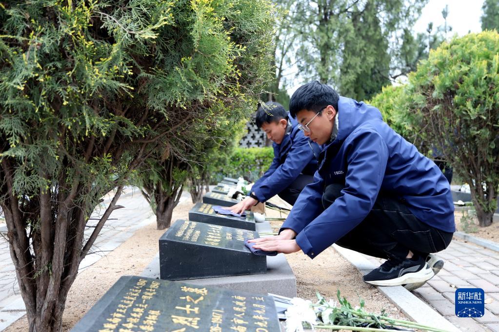 4月3日,在山東省青島西海岸新區烈士陵園,青年志愿者在擦拭英烈墓碑。