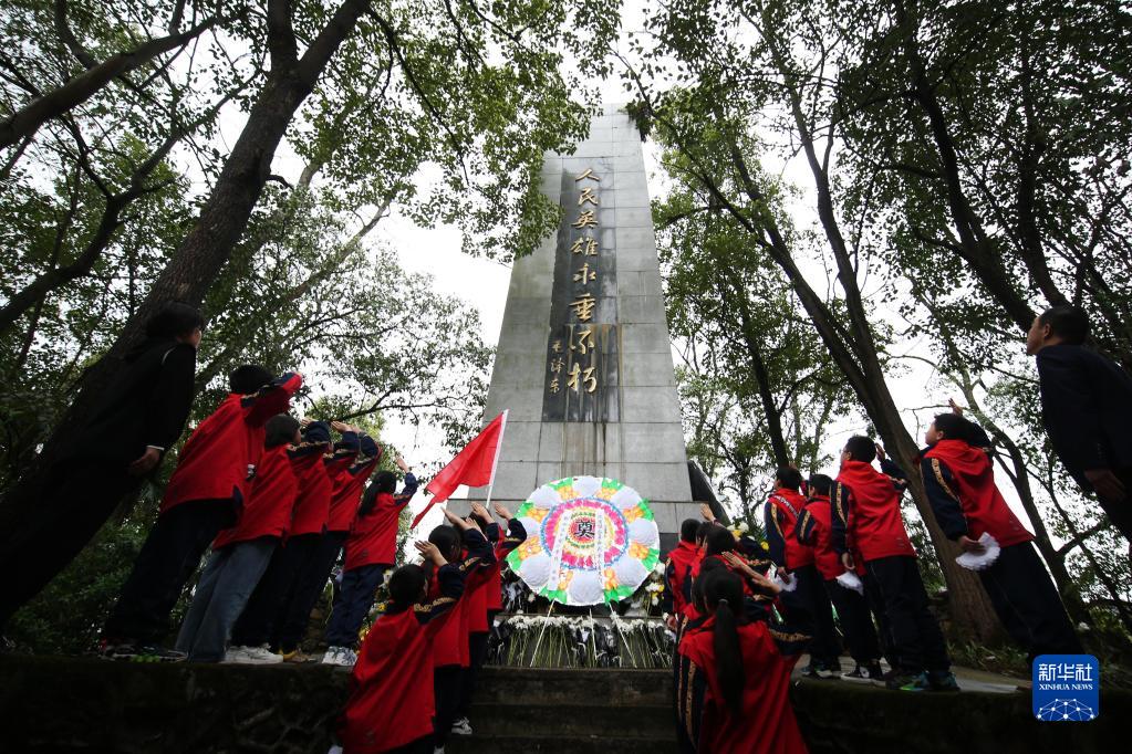 4月4日,在重慶市黔江區革命烈士陵園,少先隊員向紀念碑行隊禮。