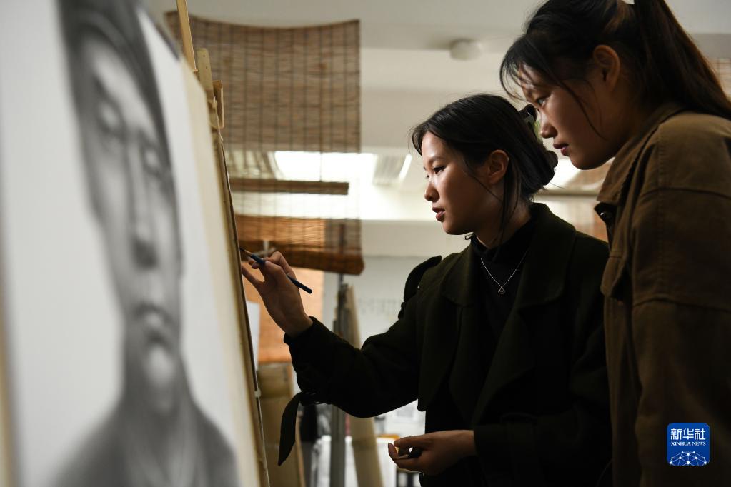 3月31日,在安徽師范大學(xué),“00后”大學(xué)生胡守瑩(左)為烈士畫(huà)像。