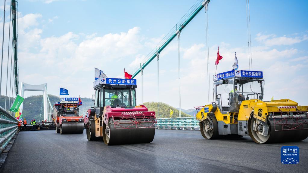 在金烽烏江大橋,貴州公路集團工人駕駛攤鋪機進(jìn)行橋面鋪裝施工(4月3日攝)。