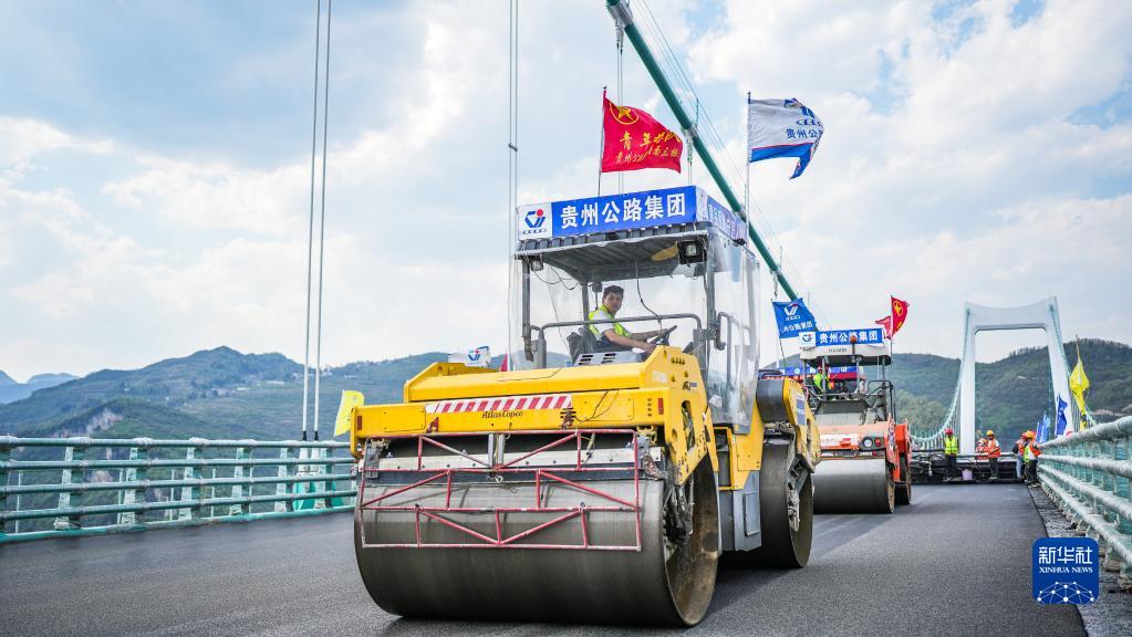 在金烽烏江大橋,貴州公路集團工人駕駛攤鋪機進(jìn)行橋面鋪裝施工(4月3日攝)。