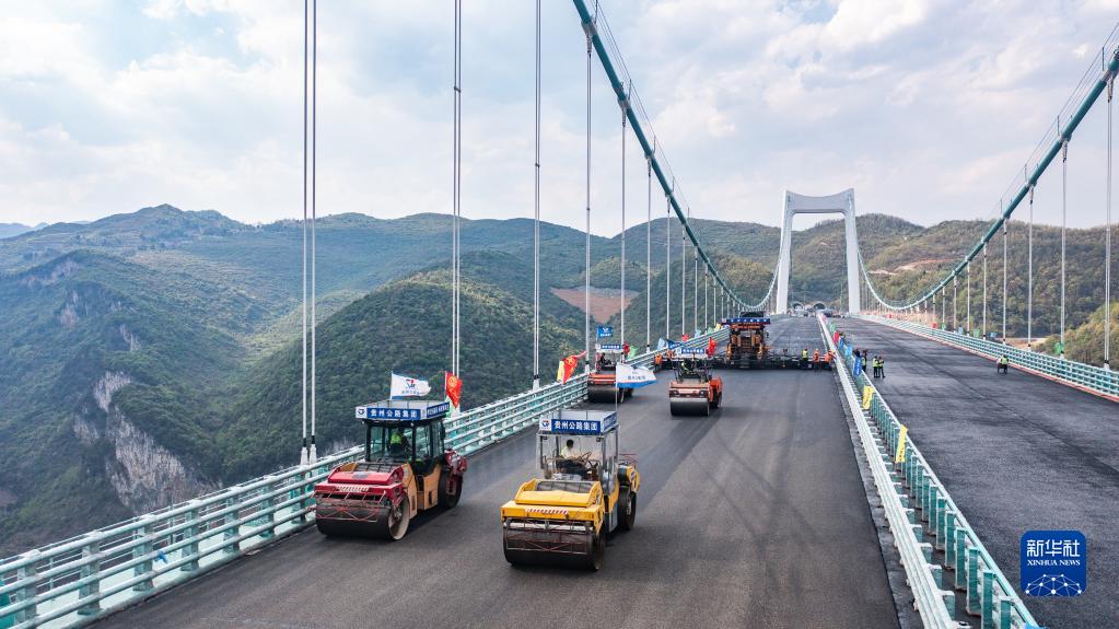 在金烽烏江大橋,貴州公路集團工人駕駛攤鋪機進(jìn)行橋面鋪裝施工(無(wú)人機照片,4月3日攝)。