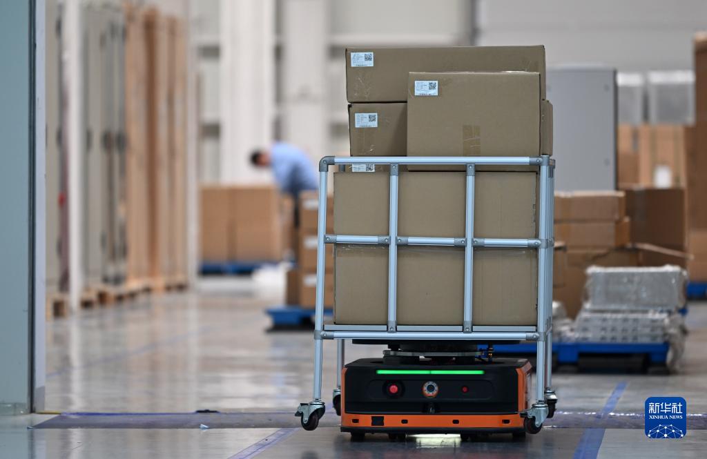 4月3日,運輸機器人在天津武清交控技術(shù)裝備有限公司的車(chē)間內作業(yè)。