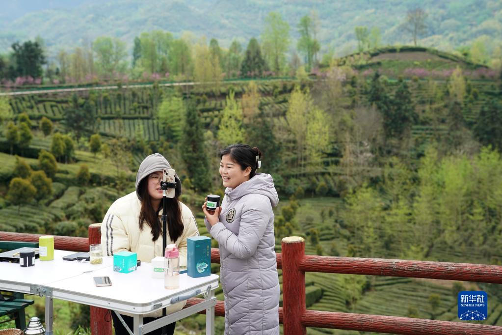 4月4日,電商主播在西鄉縣峽口鎮茶園內直播銷(xiāo)售茶葉。