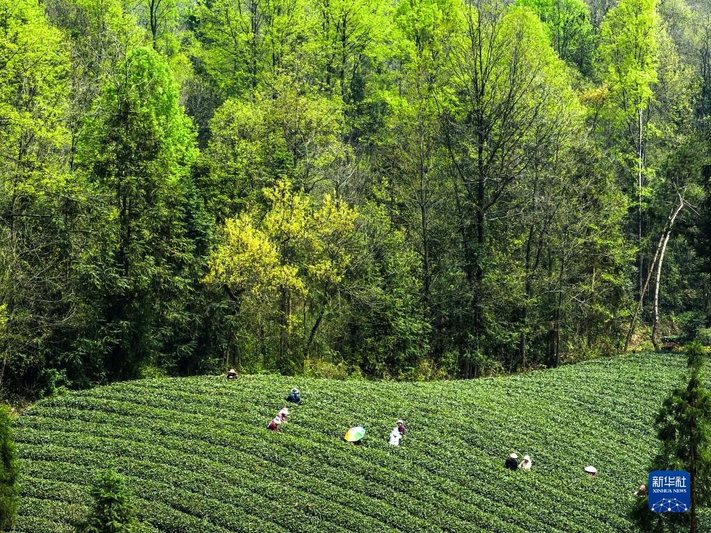 4月4日,茶農在遵義市湄潭縣流河渡生態(tài)茶園內采摘茶葉。