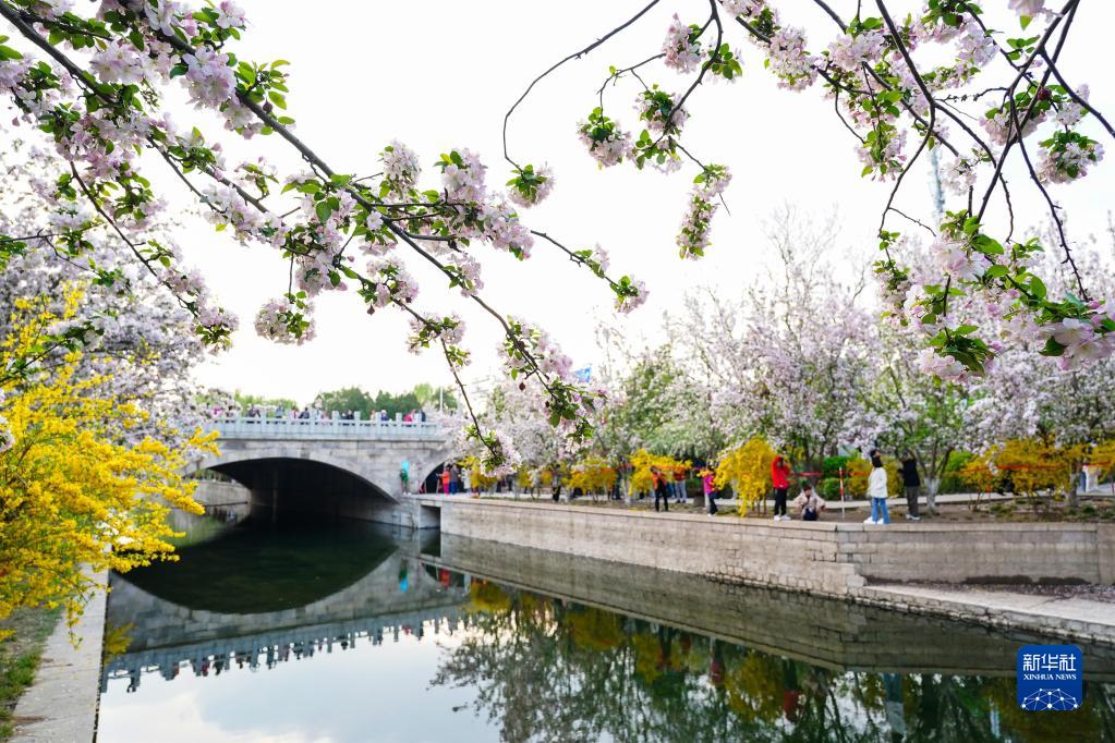 4月5日,人們在北京元大都城垣遺址公園賞花。