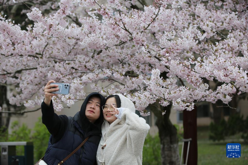 4月5日,游人在山東青島中山公園賞花拍照。