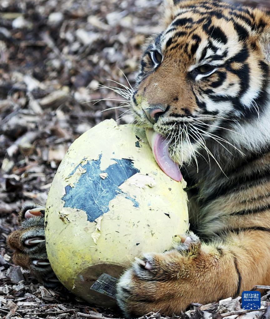 4月5日,在英國倫敦動(dòng)物園,一只蘇門(mén)答臘虎享用“彩蛋大餐”。