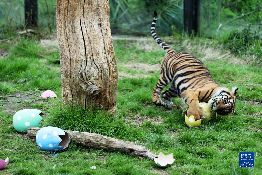 4月5日,在英國倫敦動(dòng)物園,一只蘇門(mén)答臘虎享用“彩蛋大餐”。