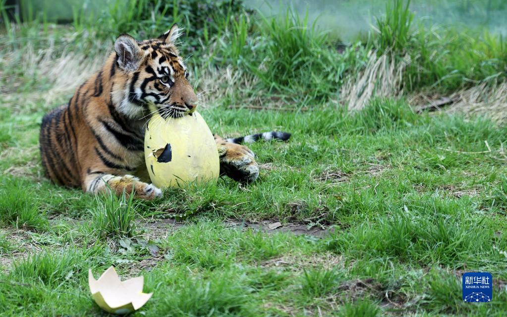 4月5日,在英國倫敦動(dòng)物園,一只蘇門(mén)答臘虎享用“彩蛋大餐”。