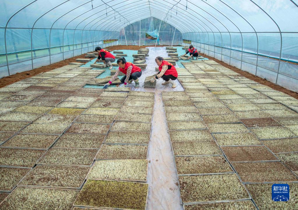 4月5日,在湖南省永州市道縣上關(guān)街道向陽(yáng)村,農民在和豐農機專(zhuān)業(yè)合作社育秧基地擺放秧盤(pán)。