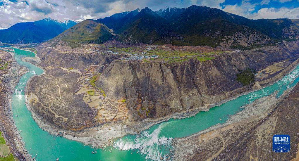 鳥(niǎo)瞰雅魯藏布江畔的索松村(無(wú)人機拼接照片,4月5日攝)。