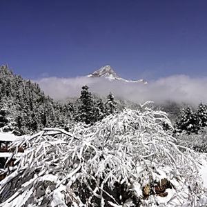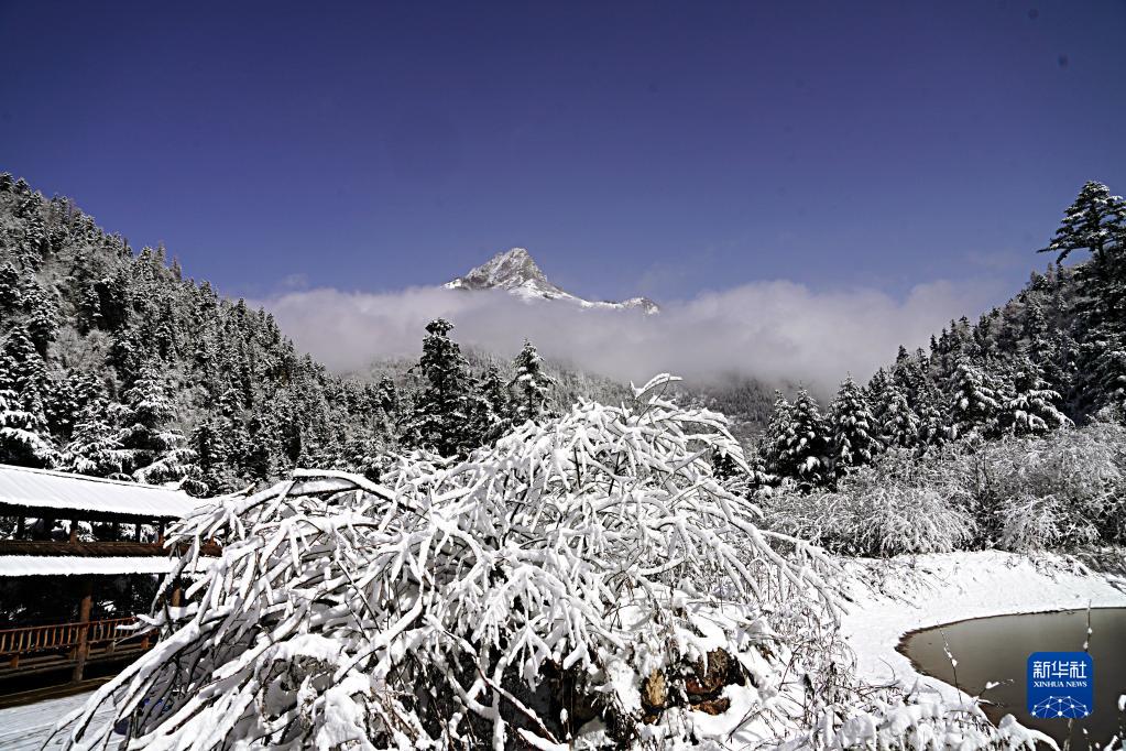 一場(chǎng)春雪過(guò)后,位于甘肅省隴南市宕昌縣的官鵝溝森林公園銀裝素裹,山巒之間云霧飄渺,美不勝收。