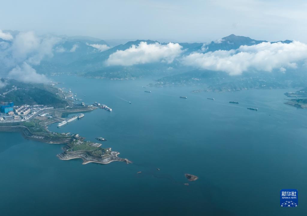 4月6日,船舶行駛在三峽大壩上游湖北省宜昌市秭歸縣水域(無(wú)人機照片)。