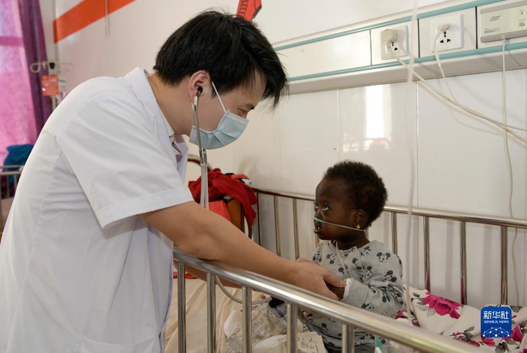 3月21日,在塞內加爾迪亞姆尼亞久兒童醫院,中國第19批援塞內加爾醫療隊兒科醫生湯榮寧為患兒做檢查。
