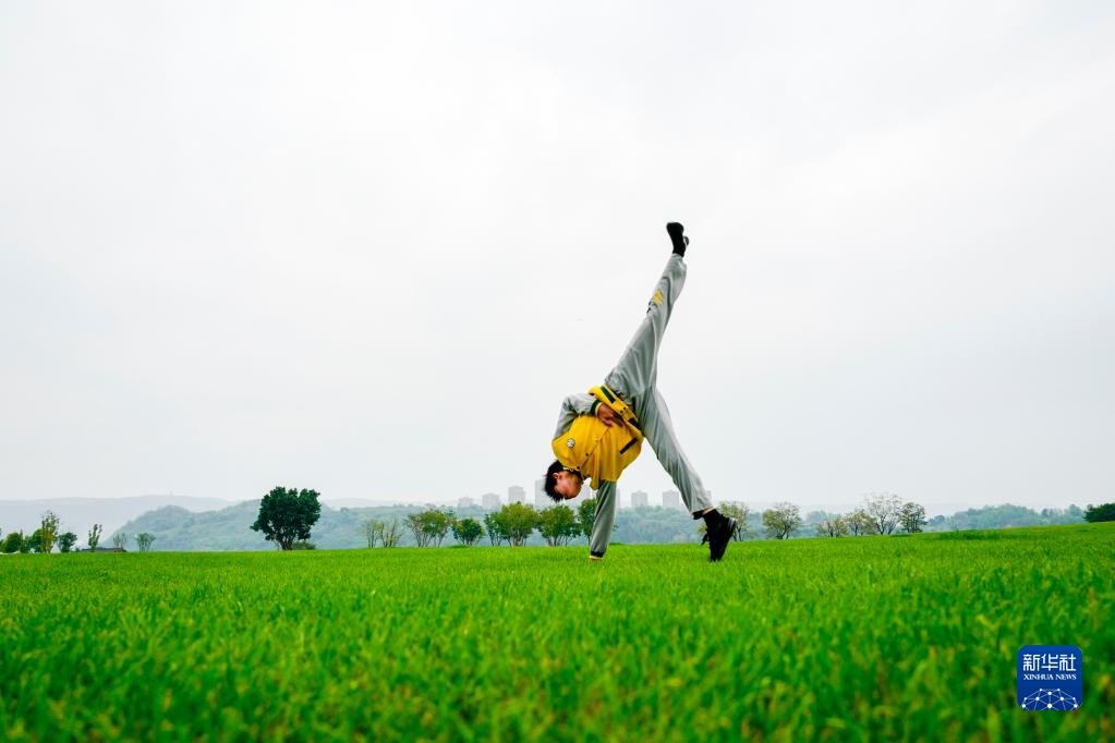 3月31日,重慶廣陽(yáng)島的一片草地上,一名重慶市特殊教育中心視力障礙學(xué)生在翻跟斗。
