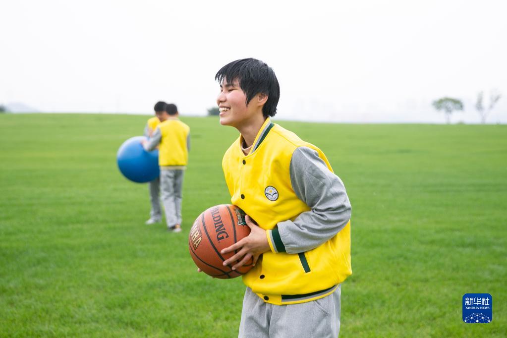 3月31日,在重慶廣陽(yáng)島,重慶市特殊教育中心的視力障礙學(xué)生在草坪上玩籃球。