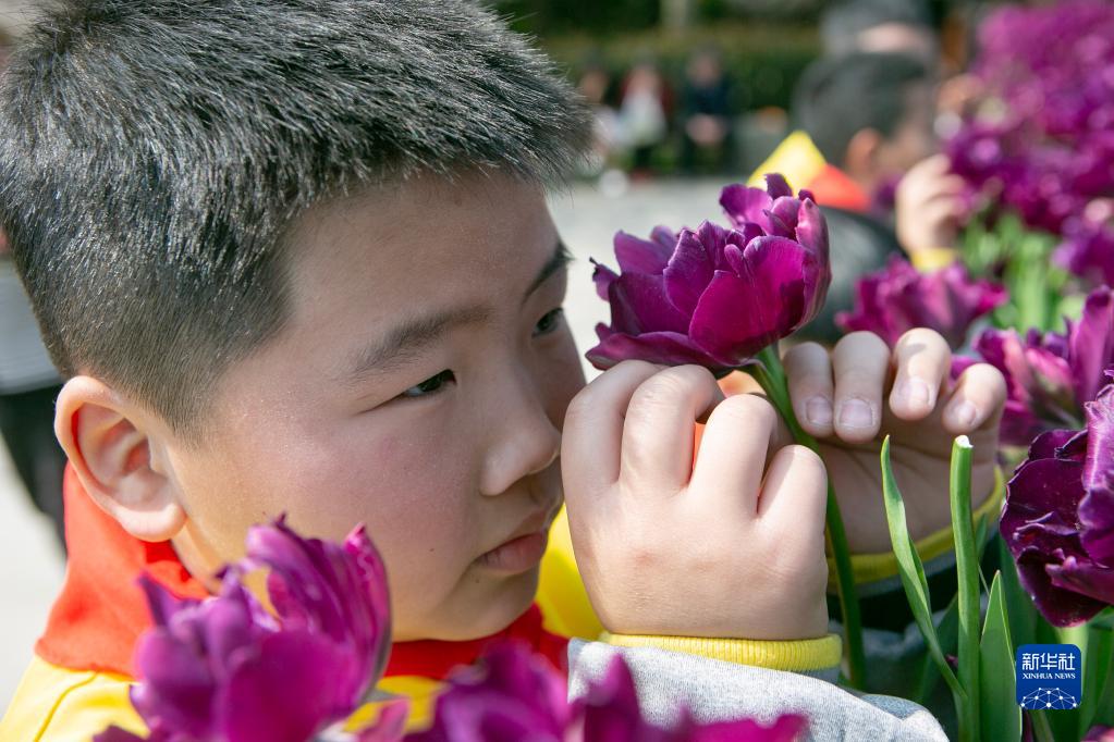 3月14日,重慶市特殊教育中心的視力障礙學(xué)生在重慶市南山植物園輕輕觸摸花朵。