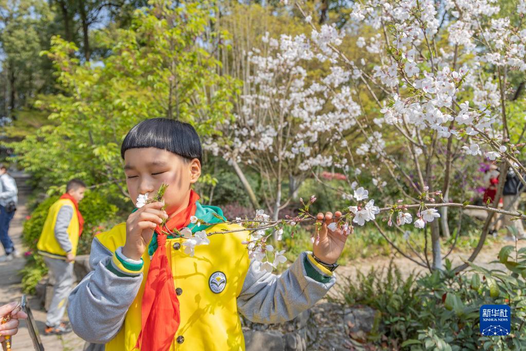3月14日,重慶市特殊教育中心的視力障礙學(xué)生在重慶市南山植物園輕輕觸摸花朵、聞花香。