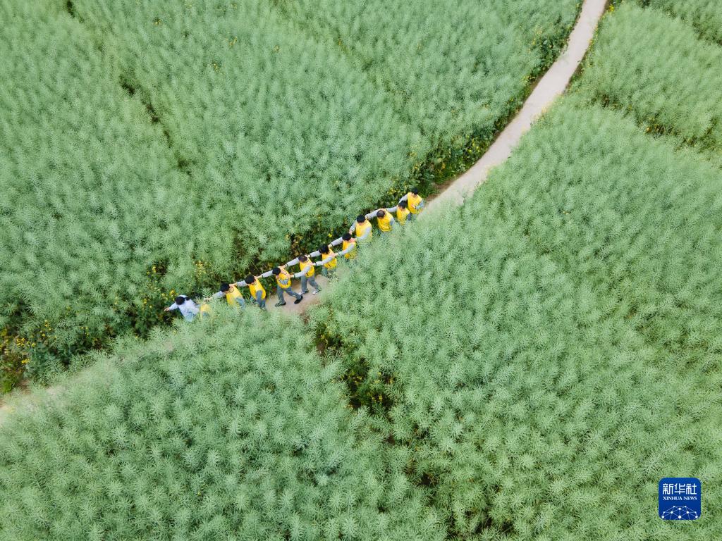 3月31日,在重慶廣陽(yáng)島,重慶市特殊教育中心的視力障礙學(xué)生和老師李英(左一)行走在油菜田中(無(wú)人機照片)。