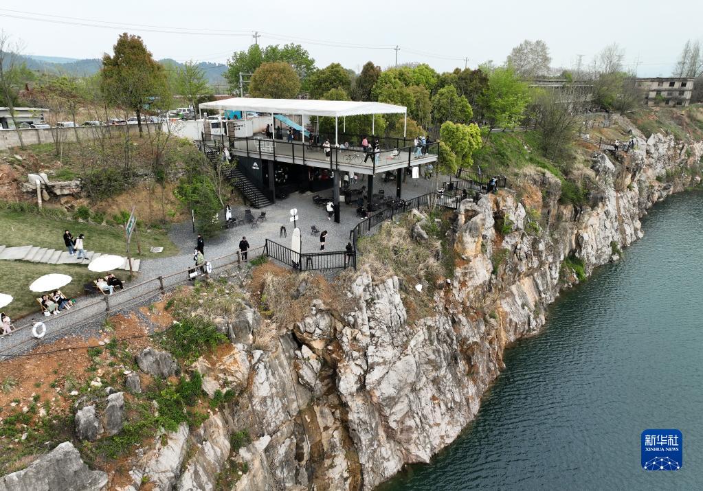 這是安吉縣梅溪鎮紅廟村一處廢棄礦坑旁的深藍計劃咖啡館(4月7日攝,無(wú)人機照片)。
