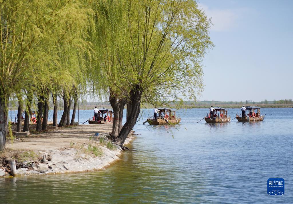 4月7日,處于試運營(yíng)階段的白洋淀“水上巴士”項目生態(tài)木船在白洋淀內行駛。