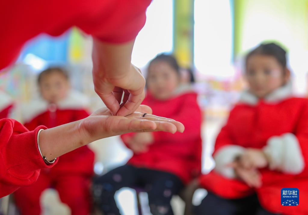 4月7日,在貴州省黔東南苗族侗族自治州岑鞏縣天馬幼兒園,老師在指導小朋友學(xué)習正確的洗手方法。