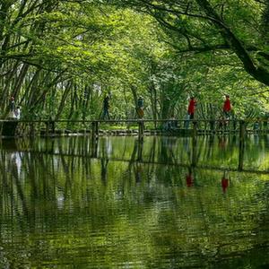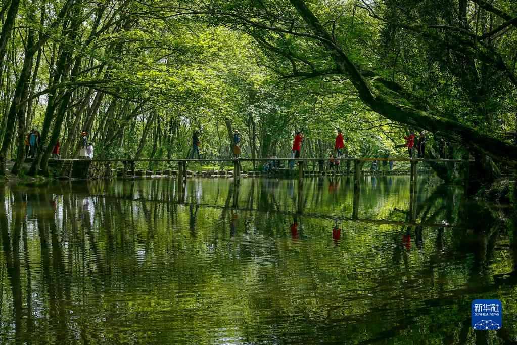 4月7日,游客在黃山市徽州區西溪南濕地踏青賞景。