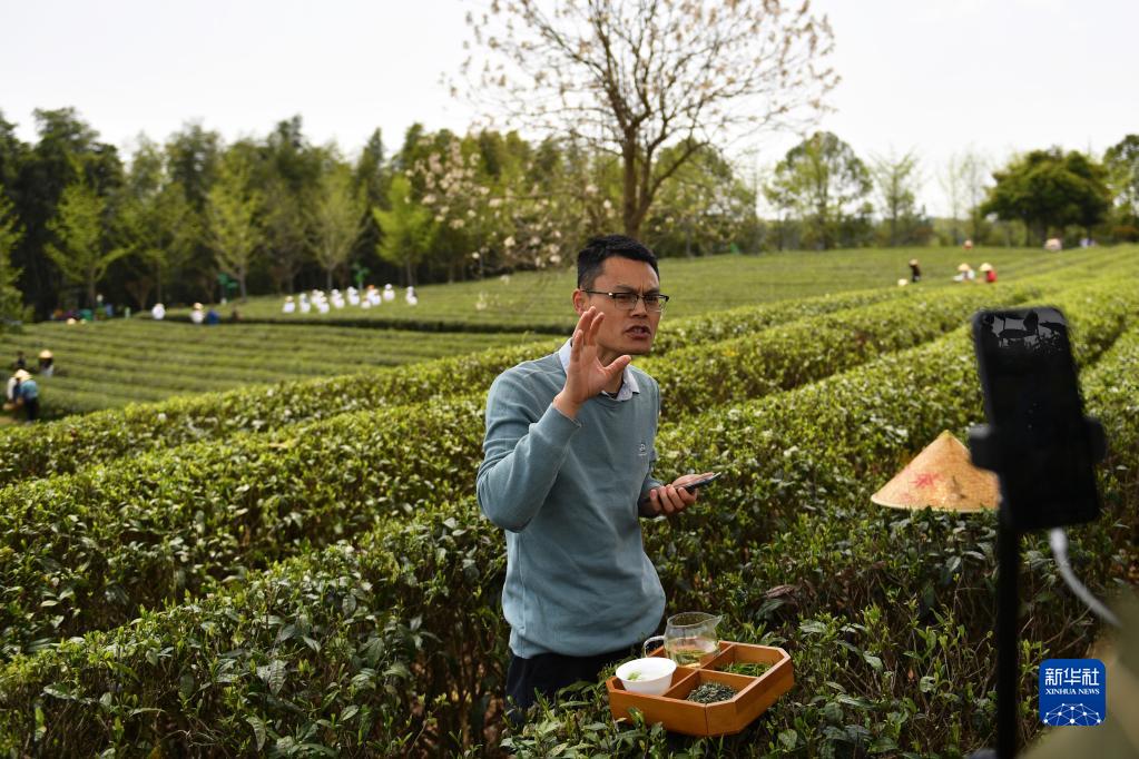 4月7日,工作人員在湖南省長(cháng)沙市長(cháng)沙縣金井鎮的金井茶旅融合產(chǎn)業(yè)園直播帶貨。