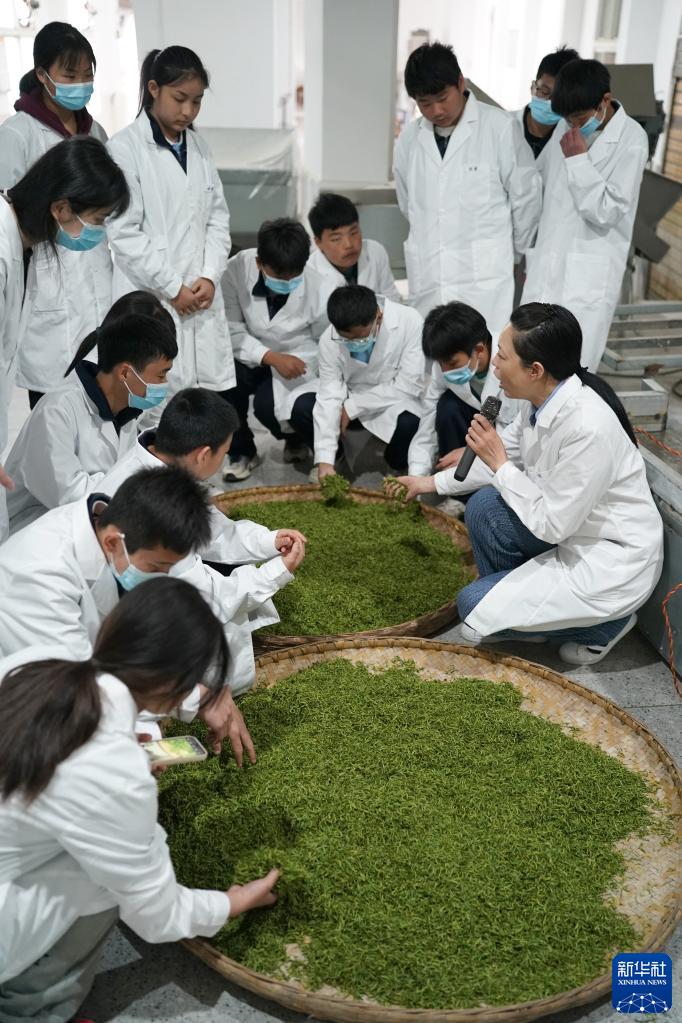 3月29日,安康市紫陽(yáng)縣職業(yè)教育中心茶葉專(zhuān)業(yè)的學(xué)生在該縣一家茶廠(chǎng)學(xué)習茶葉鮮葉的干燥工藝。